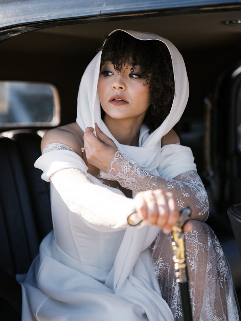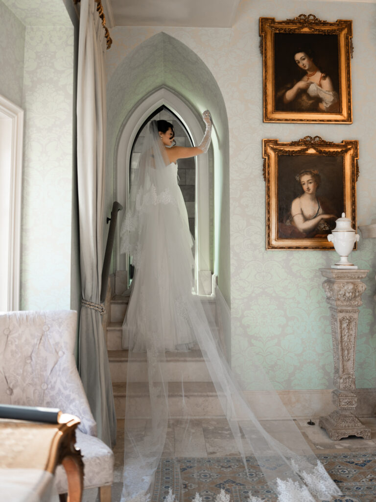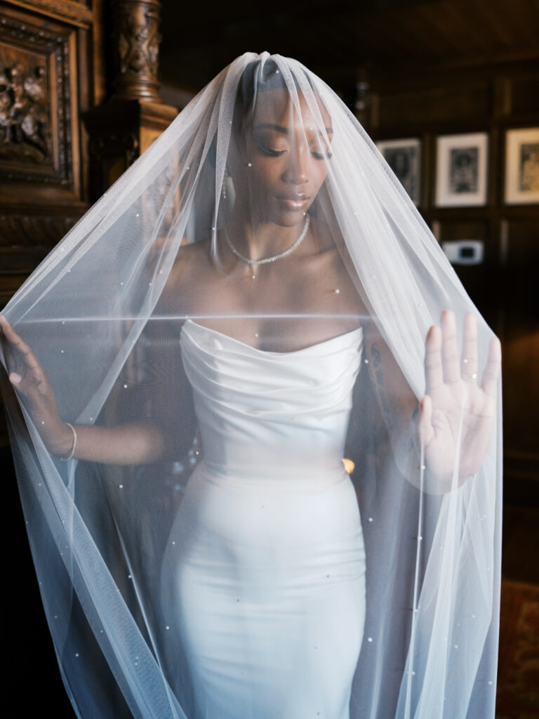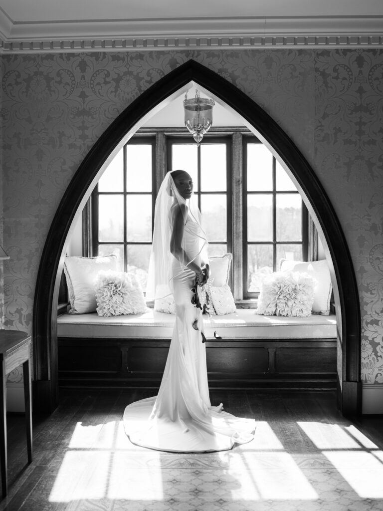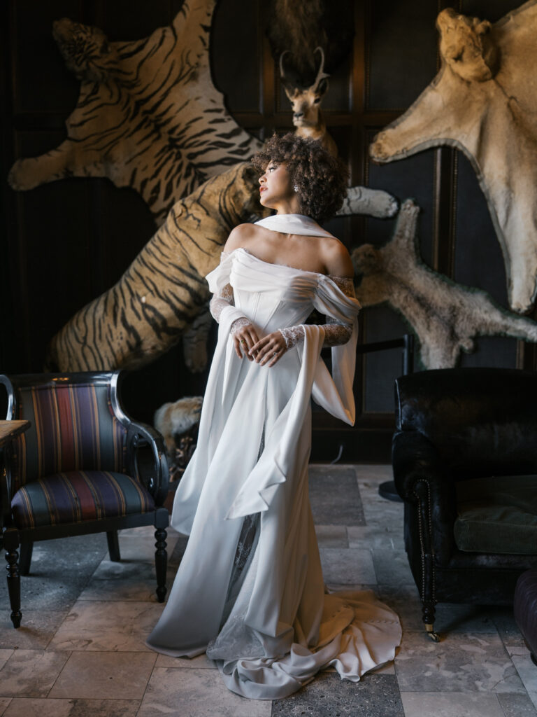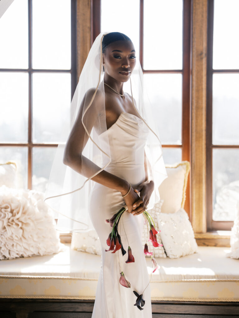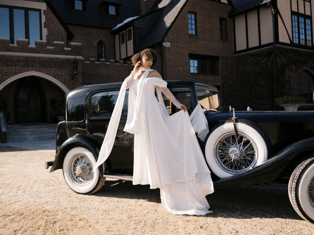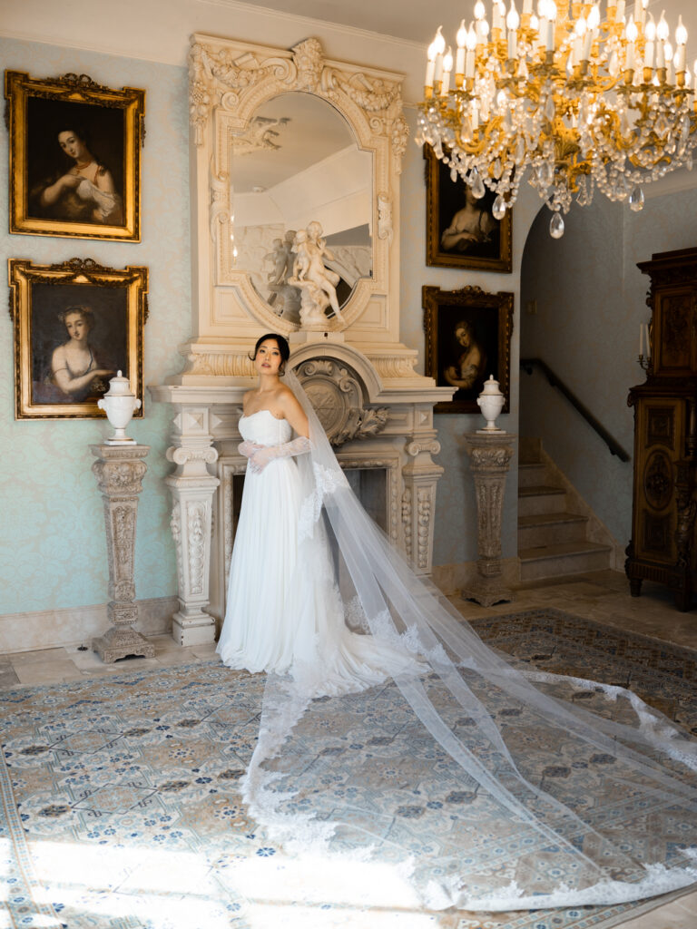We worked through distinct bridal looks and moods throughout the session. The first was clean and modern, a sleek, fitted gown paired with a dramatic veil and a show stopping cascading calla lily bouquet that felt both sculptural and unexpected. The second took on something more ethereal, a flowing cape gown that felt right at home against the estate’s hunting room and the vintage car waiting just outside the entrance.