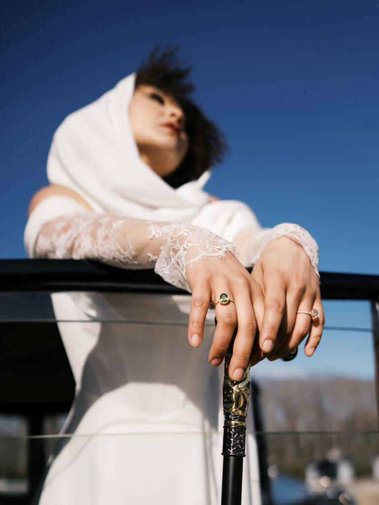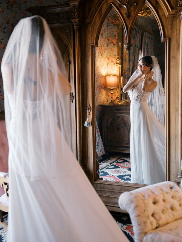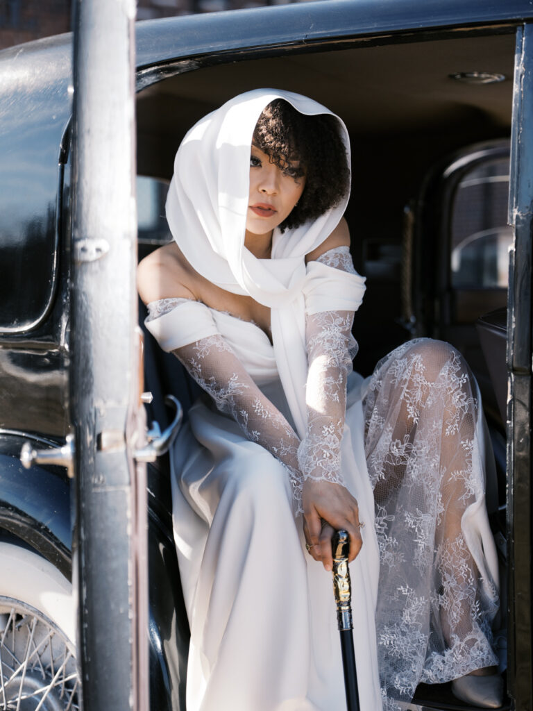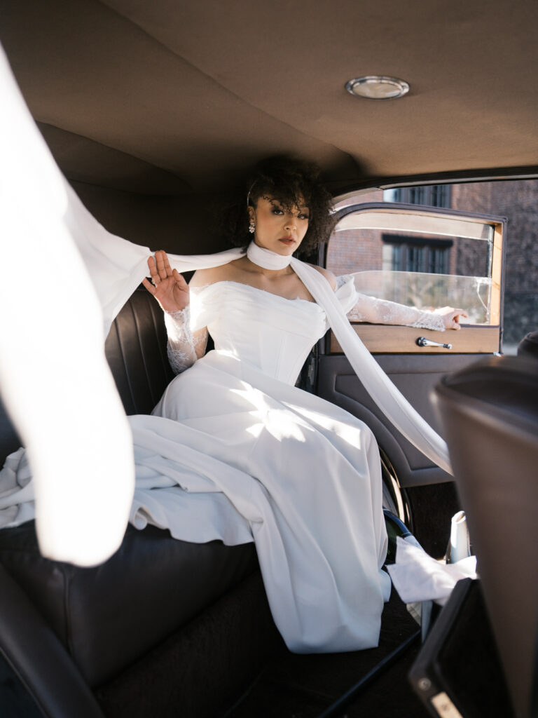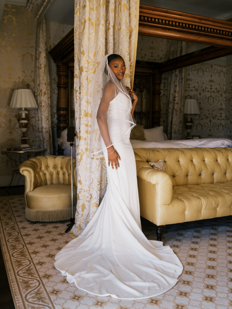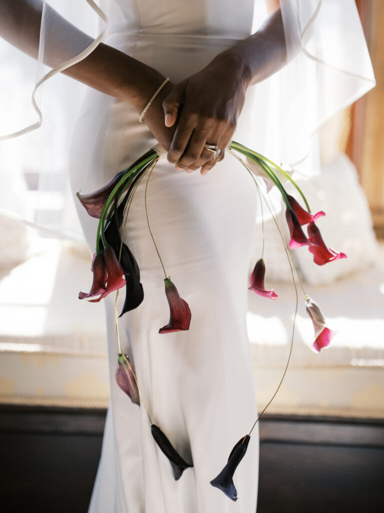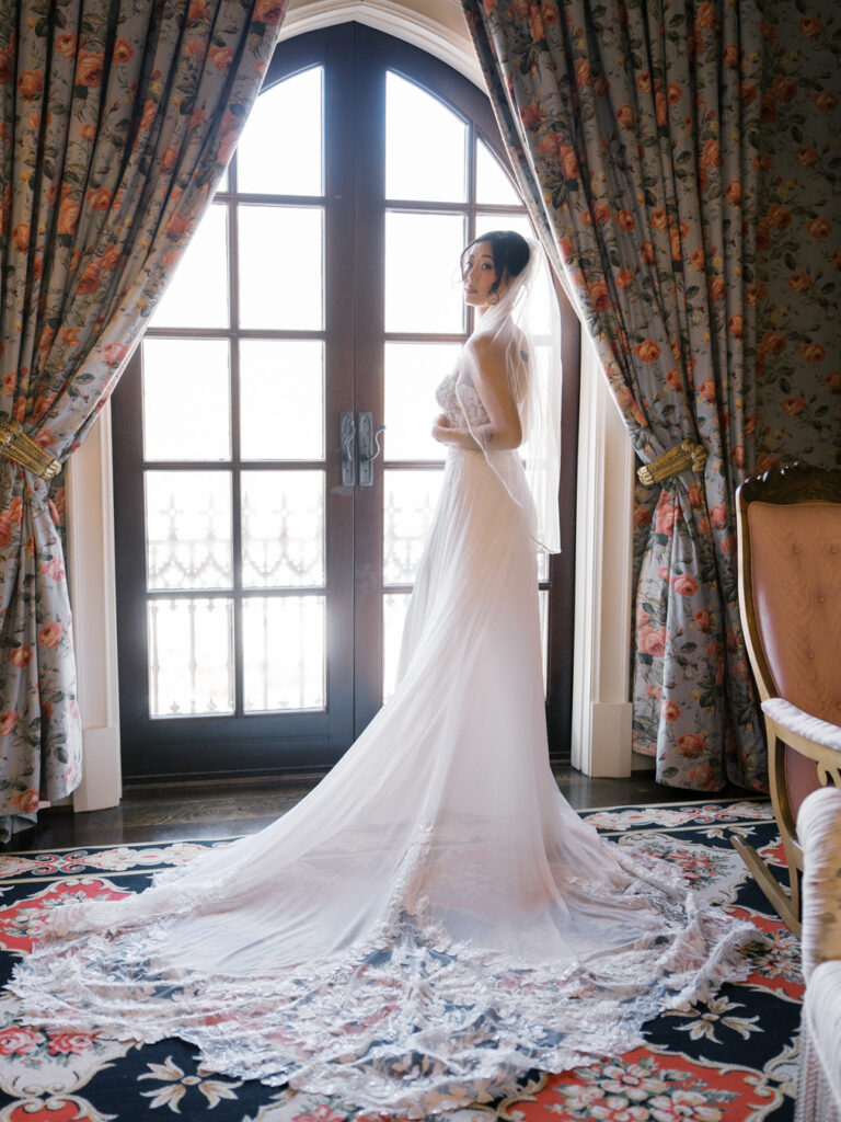 We worked through distinct bridal looks and moods throughout the session. The first was clean and modern, a sleek, fitted gown paired with a dramatic veil and a show stopping cascading calla lily bouquet that felt both sculptural and unexpected. The second took on something more ethereal, a flowing cape gown that felt right at home against the estate’s hunting room and the vintage car waiting just outside the entrance.