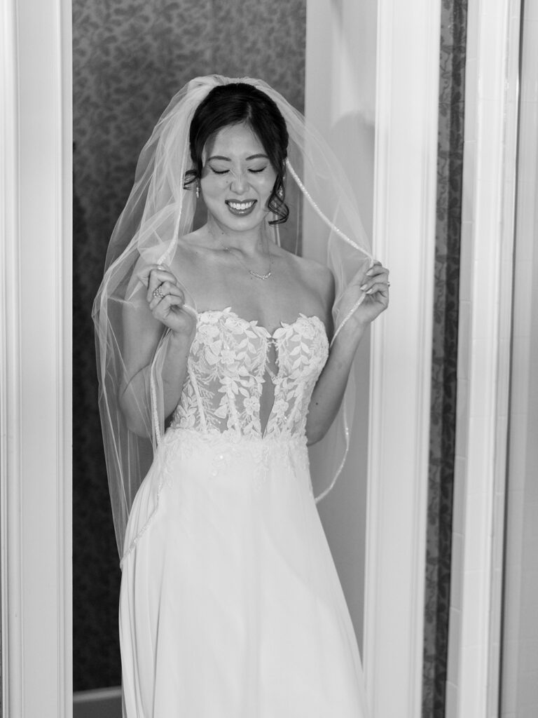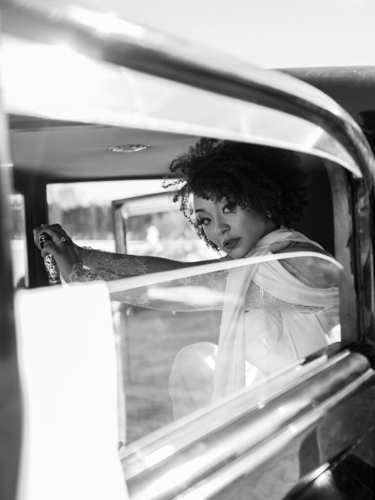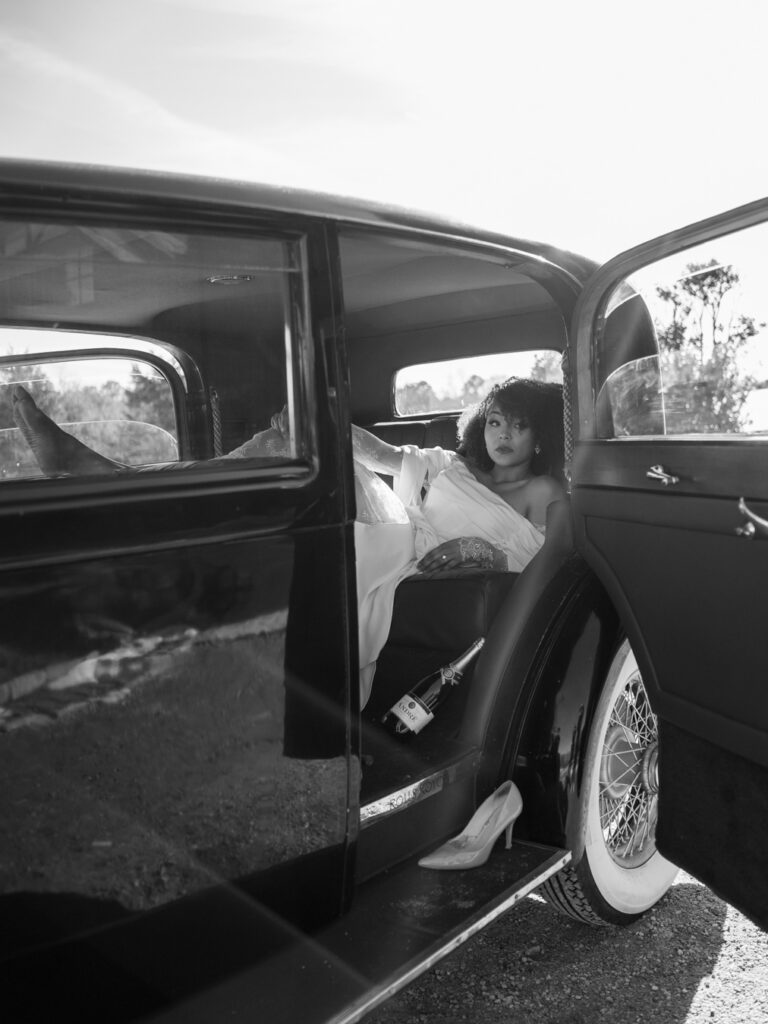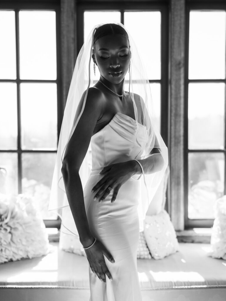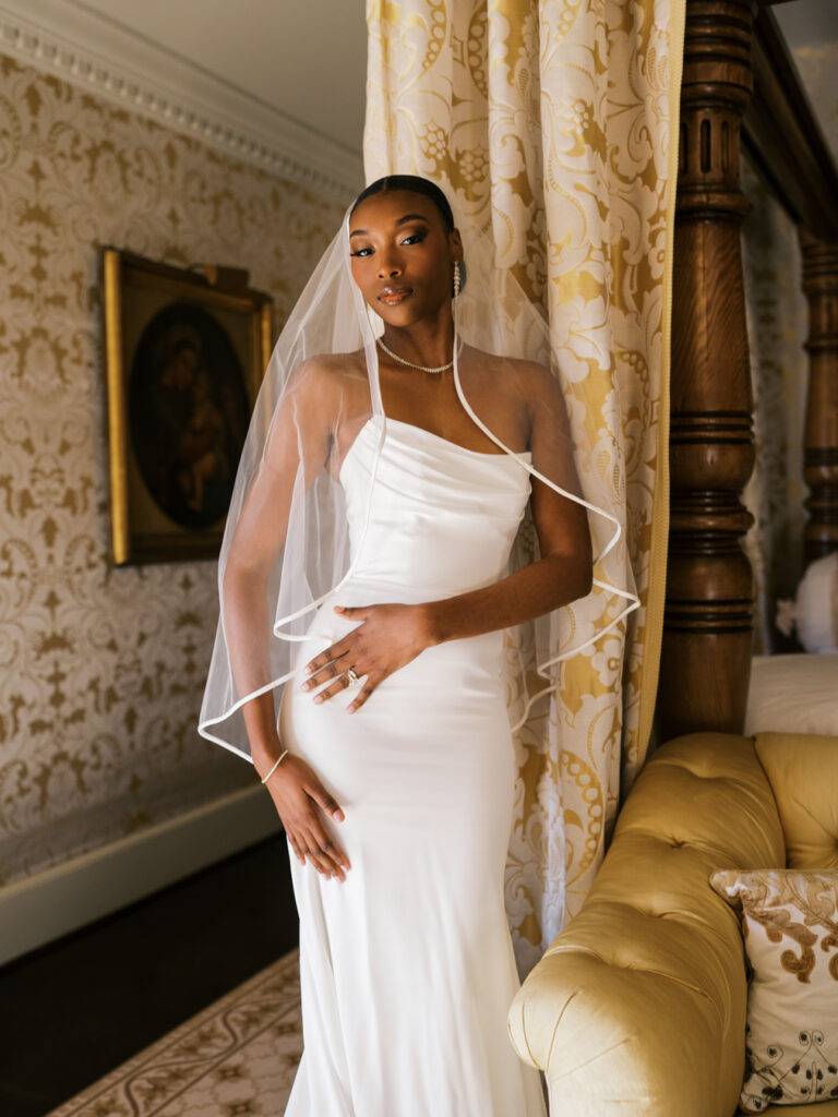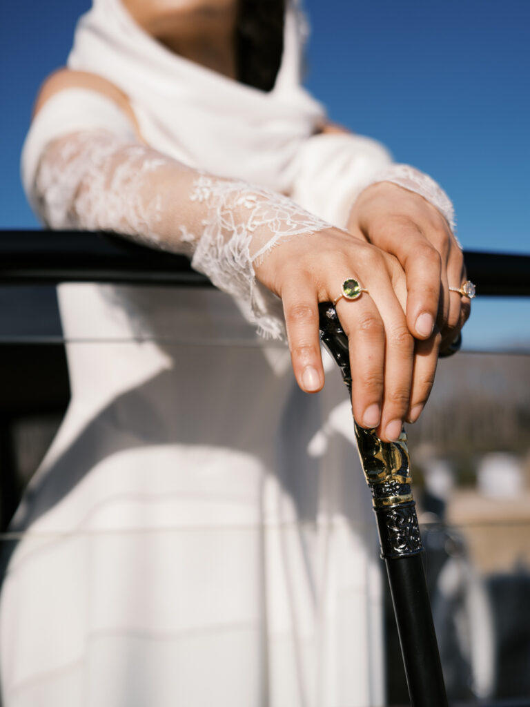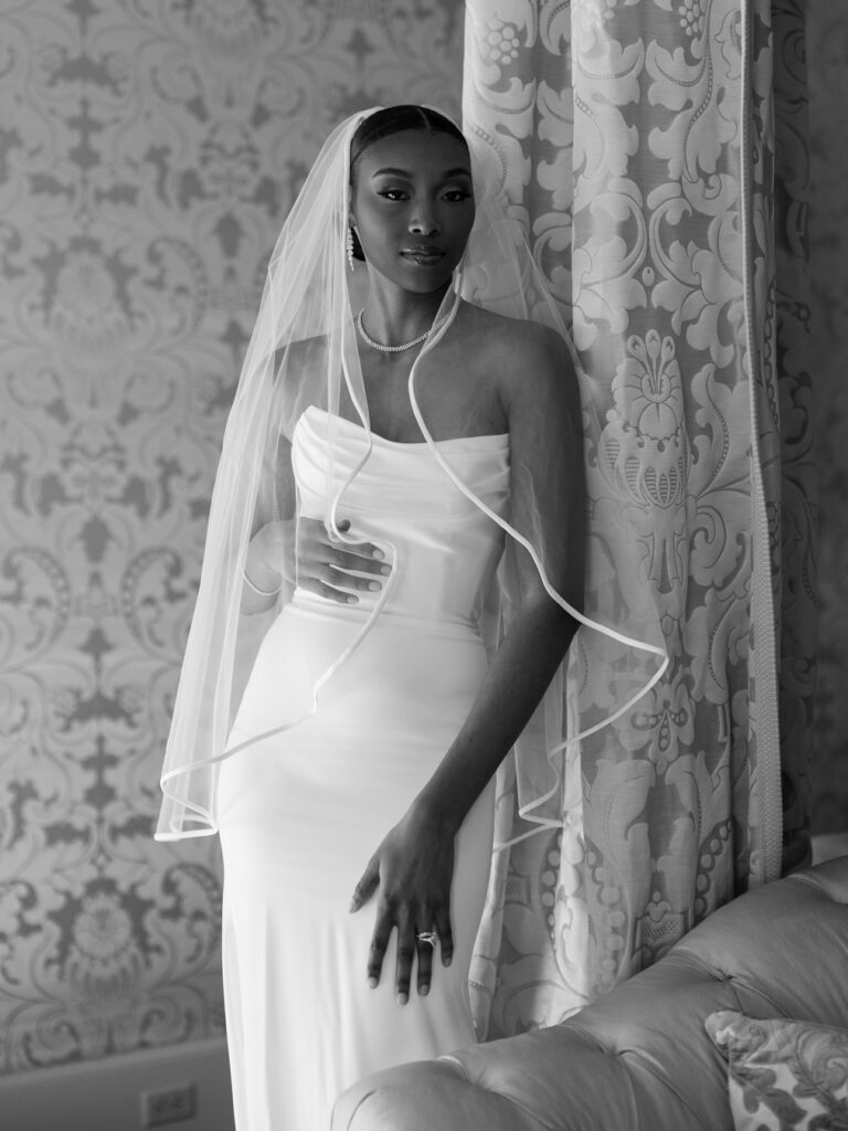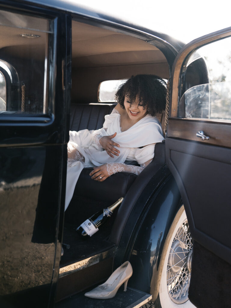 We worked through distinct bridal looks and moods throughout the session. The first was clean and modern, a sleek, fitted gown paired with a dramatic veil and a show stopping cascading calla lily bouquet that felt both sculptural and unexpected. The second took on something more ethereal, a flowing cape gown that felt right at home against the estate’s hunting room and the vintage car waiting just outside the entrance.